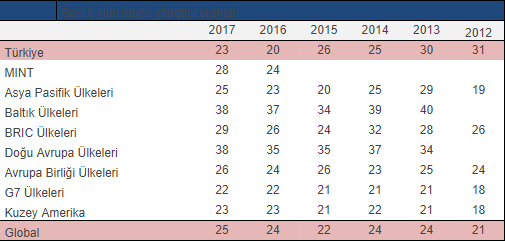 Grant Thornton’un araştırmasının Türkiye sonuçları son bir yılda 3 puanlık bir artış gösterse de son 6 yıllık seyirde maalesef düşüşe işaret ediyor. 2012’de %31 olarak gerçekleşen oran 2017’de %23’e kadar geriliyor. Türkiye’de son 6 yıl içinde 8 puanlık bir düşüş söz konusu. Yine de Türkiye, her dört yöneticiden birinin kadın olduğu %25’lik global ortalamaya çok yaklaşmış durumda ve %23’lük ortalaması ile Türkiye, Amerika, Hollanda, İngiltere ve Almanya gibi ülkeleri geride bırakıyor.