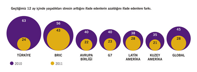 Araştırmaya Türkiye’den katılan yöneticilerin durumu hayli ilginç çünkü dikkat çekici bir azalma söz konusu. 2012 sonuçlarında, geçilen 12 ay içinde stress seviyelerinin arttığını belirtenlerin oranı net* %63 iken, 2011 sonunda bu oran %24’e kadar geriledi. 2010’da, global ortalama 45% iken, 2011’de %28’e düştü. En şaşırtıcı sonuç ise Avrupa’dan. İçinde bulundukları tüm olumsuzluklara rağmen 2010 sonunda %40’lık grup artış belirtirken, 2011 sonunda bu oran %22’ye düşüyor. Sonuçları değerlendiren Grant Thornton Türkiye Vergi Ortaklarından Emin Taylan, artan belirsizliğe rağmen stress oranında düşüş olmasının kendisi için sürpriz bir sonuç olduğunu belirterek, ekonomik krizin devamıyla birlikte, iş dünyası liderlerinin karşılaştıkları sıkıntı verici durumları daha iyi yönettiklerini ve daha gerçekci ve erişilebilir hedefler ile üzerlerindeki stresin etkisini daha az hissetmeye başlamış olabileceklerini ifade etti.