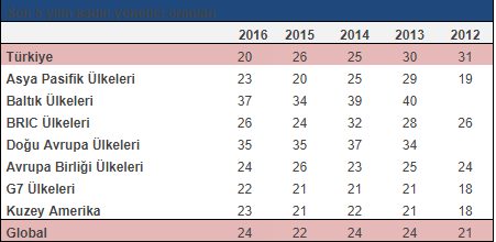 - Türkiye’de, yönetimdeki kadın yüzdesi, 2012 yılında %31 iken, 2016’da %20’ye geriledi. Türkiye’den katılan şirketlerin %43’ünde hiçbir kadın yönetici yer almıyor