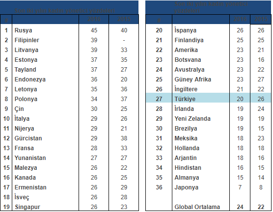 - Türkiye, %20’lik kadın yönetici oranı ile, 36 ülke arasında 27. sırada