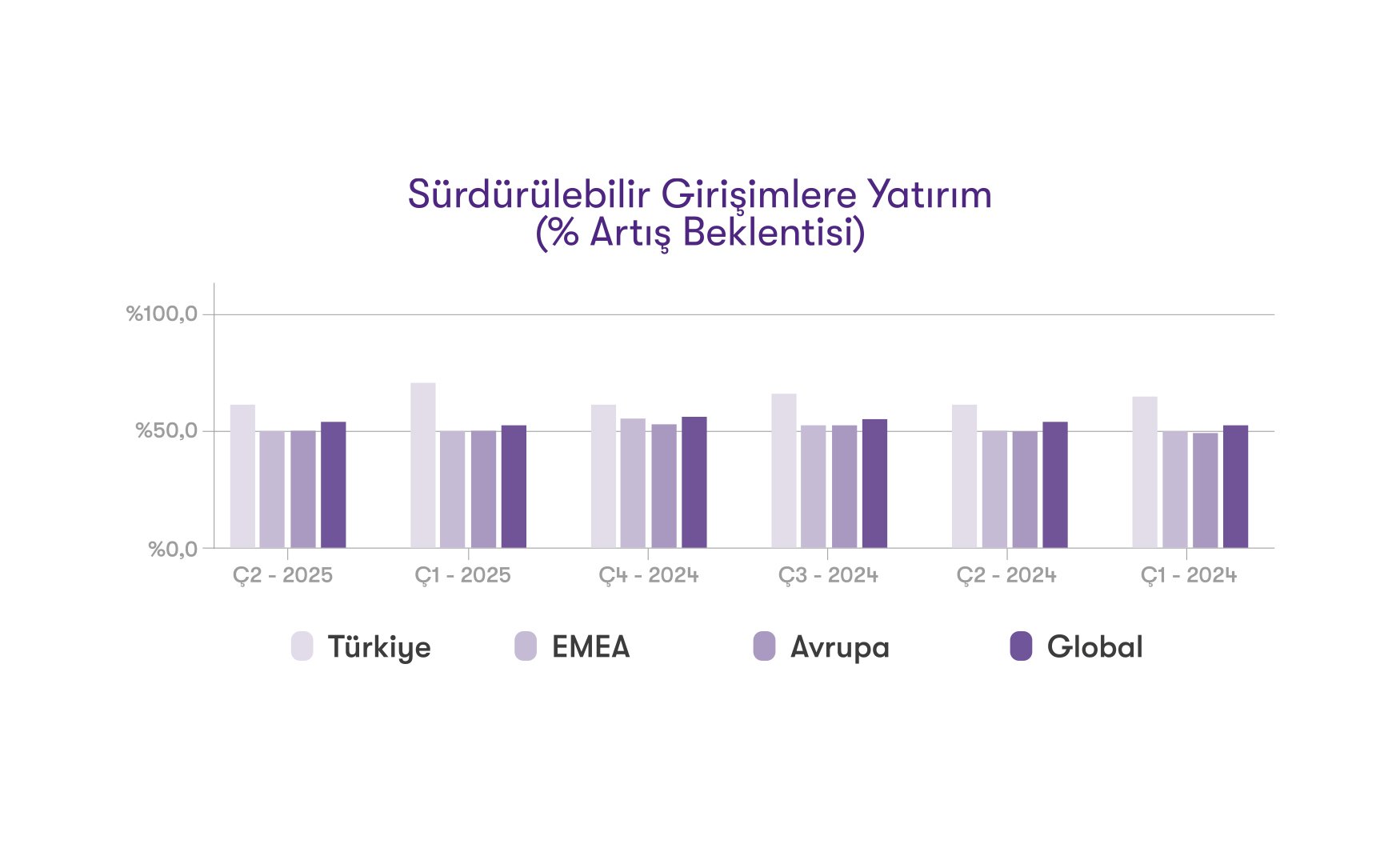 1) 2025’in 2. çeyreğinde Türkiye, sürdürülebilirlik yatırımlarına ilişkin beklentilerde küresel ve bölgesel ortalamaların oldukça üzerinde yer alarak %65,3 ile güçlü bir iyimserlik sergiliyor. Küresel oran %56,5 olarak oluşurken, Avrupa ve EMEA ortalamaları ise %52–53 seviyesinde. Küresel beklentiler dalgalansa da toparlanma eğiliminde; Türkiye ise istikrarlı biçimde yüksek güvenini koruyor. Sektörel olarak Özel Sermaye, Teknoloji ve Bankacılık öne çıkarken, Varlık Yönetimi keskin bir düşüş gösteriyor. Enerji sektörü dalgalı, kamu ve hizmet sektörleri ise geride kalıyor. Genel olarak Türkiye, sürdürülebilirlik yatırımlarında güçlü ve dirençli bir iyimserlik sergiliyor.