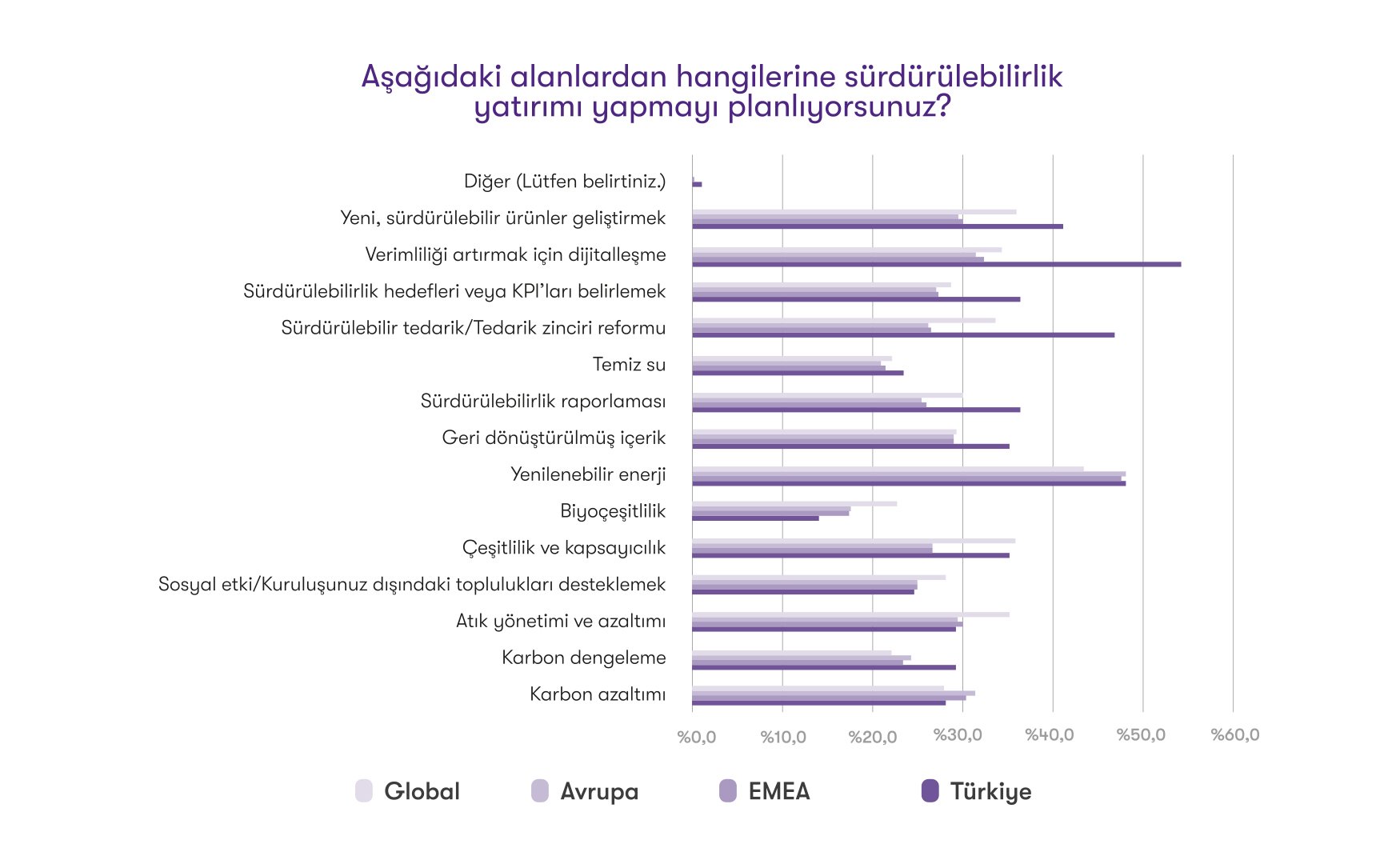 2) 2025 itibarıyla Türkiye, sürdürülebilirlik yatırımlarında dijitalleşme (%54,1) ve yenilenebilir enerji (%48,2) alanlarında küresel ve bölgesel ortalamaların oldukça üzerinde konumlanıyor. Şirketlerin %47,1’i sürdürülebilir tedarik zinciri reformu planlayarak bu alanda da liderlik gösteriyor. Çeşitlilik ve kapsayıcılığa yönelik yatırımlar (%35,3) küresel trendlerle paralel ilerliyor. Karbon azaltımı küresel ortalamayla eşit olsa da, raporlama (%36,5) ve şeffaflık konularında Türkiye öne çıkıyor. Sektörel olarak kamu sektörü tedarik zincirinde, teknoloji sektörü yenilenebilir enerjide, özel sermaye ise kapsayıcılıkta öne çıkıyor. Genel olarak Türkiye enerji dönüşümü, dijitalleşme ve şeffaflıkta güçlü bir liderlik sergiliyor.