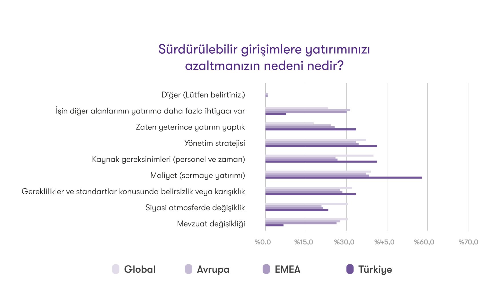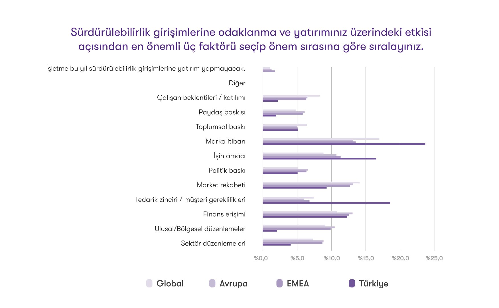 4) Türkiye’de sürdürülebilirlik yatırıml arını en güçlü şekilde yönlendiren unsurlar marka itibarı (%23,5) ve tedarik zinciri/müşteri gereklilikleri (%18,4). Bu oranlar küresel ve bölgesel ortalamaların çok üzerinde. Regülasyon baskısı ise oldukça düşük (%2–4), bu da Türkiye’de sürdürülebilirlik motivasyonunun yasal zorunluluktan ziyade ticari avantaj ve marka değeri odaklı olduğunu gösteriyor. İç baskılar (çalışan, paydaş) zayıf, “yatırım yapmayacağız” diyen şirket oranı yok denecek kadar az. Sektörel olarak PE ve Bankacılık sermaye/marka, Hizmetler rekabet, Kamu sosyal baskılar, Teknoloji ise marka itibarı üzerinden hareket ediyor.
