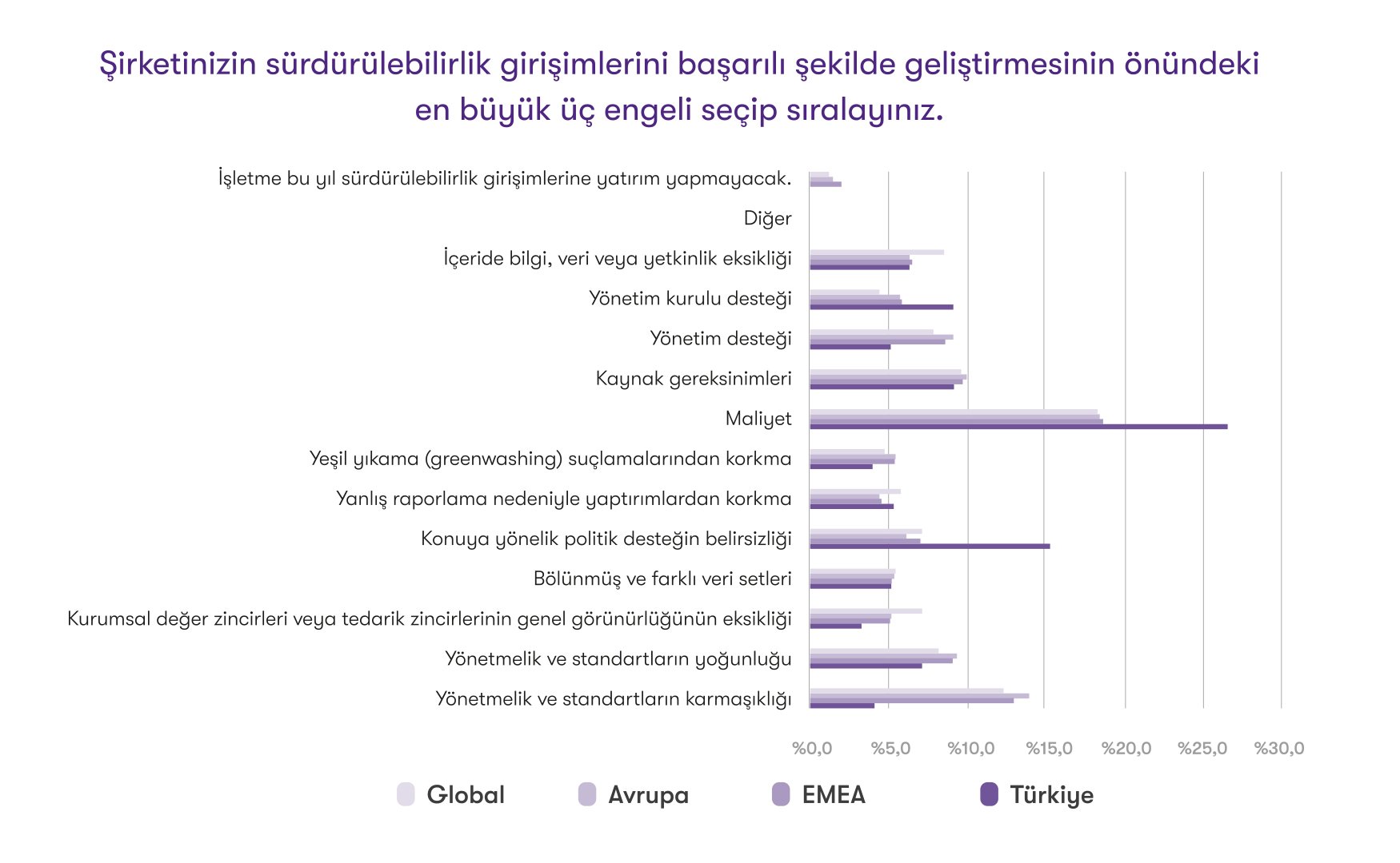 5) Türkiye’de sürdürülebilirlik yatırımlarının önündeki en büyük engel maliyet (%26,5) olup, bu oran Avrupa ve EMEA ortalamalarının oldukça üzerinde. Ayrıca siyasi belirsizlik (%15,3) de dikkat çekici biçimde yüksek. Buna karşın regülasyon karmaşıklığı (%4,1) ve hacmi (%7,1) görece düşük; yani asıl fren uyum değil, finansman yükü. Yönetim desteği icra tarafında güçlü olsa da, yönetim kurulu düzeyinde daha fazla ikna gereksinimi var. Bilgi, beceri ve veri eksiklikleri görece düşük. Sektörel bazda turizm ve sanayi maliyet baskısı altında; kamu regülasyondan, varlık yönetimi ise siyasi belirsizlikten etkileniyor. Genel olarak Türkiye’de maliyet ve politik belirsizlik, sürdürülebilirliğin temel bariyerleri.