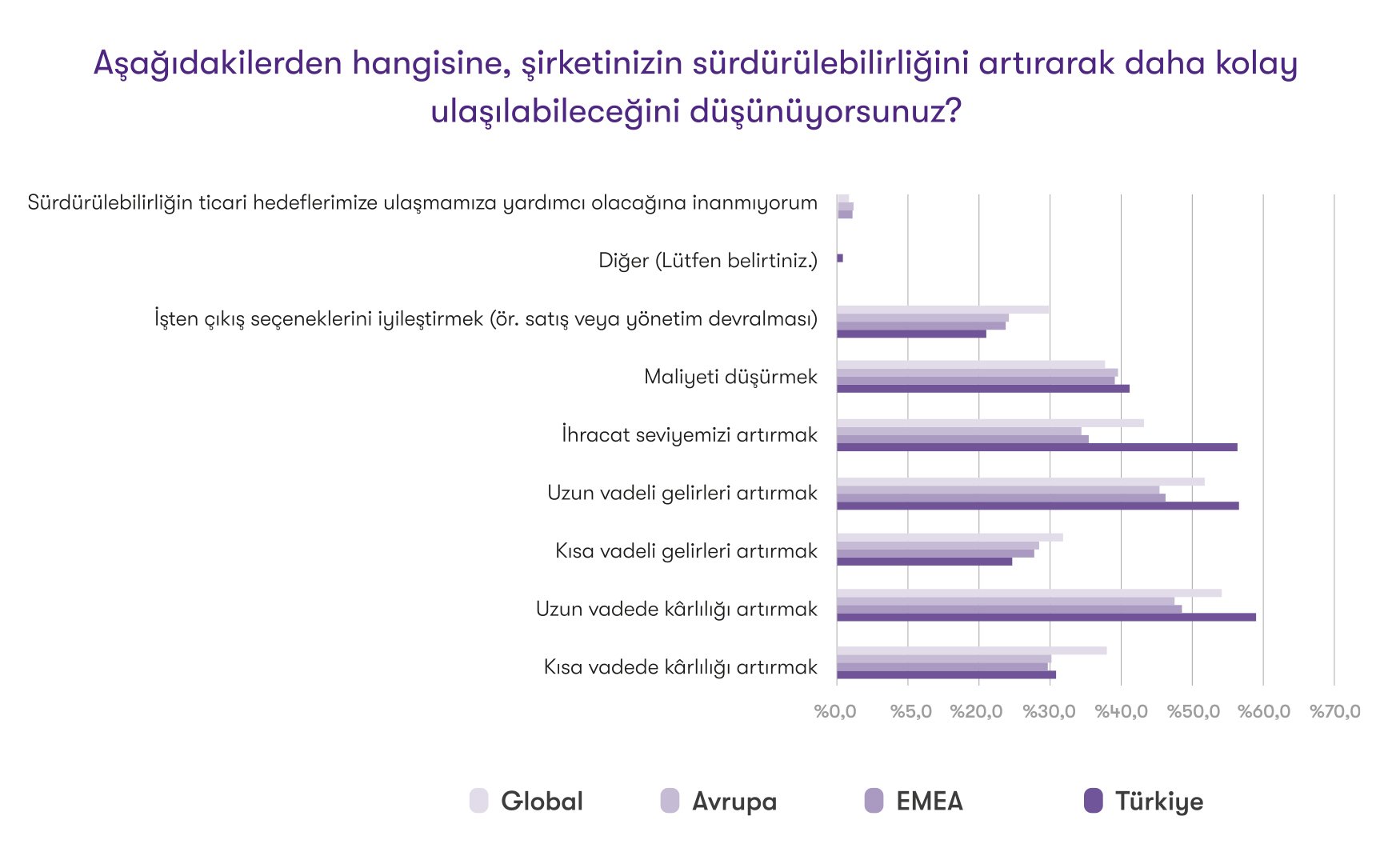 6) Türkiye’de sürdürülebilirlik yatırımları kısa vadeli kazançtan çok uzun vadeli büyüme (%56,5), kârlılık (%58,8) ve ihracat geliştirme (%56,5) hedefleriyle ilişkilendiriliyor. Bu oranlar Avrupa ve EMEA ortalamalarının oldukça üzerinde. Şirketler maliyet azaltmayı (%41,2) önemli bir avantaj olarak görürken, “exit opsiyonu” (%21,2) motivasyonu zayıf kalıyor. “Sürdürülebilirlik fayda sağlamaz” diyen hiçbir şirket bulunmuyor. Sektörel olarak teknoloji ve bankacılık uzun vadeli faydayı en net gören alanlar; kamu maliyet verimliliğine, özel sermaye ise uzun vadeli kârlılığa odaklanıyor. Genel olarak Türkiye, sürdürülebilirliği kalıcı büyüme, ihracat ve verimlilik stratejisinin merkezine yerleştirmiş durumda.