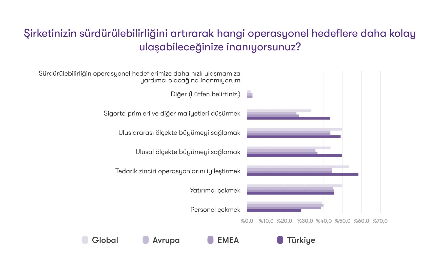 7) Türkiye’de sürdürülebilirlik yatırımları operasyonel olarak en çok tedarik zinciri verimliliği (%58,8), ulusal/uluslararası genişleme (%49,4) ve maliyet avantajı (%43,5) alanlarında etkili oluyor. Bu oranlar Avrupa ve EMEA ortalamalarının belirgin şekilde üzerinde. Buna karşın yetenek çekimi (%28,2) zayıf kalıyor. Sektörel bazda teknoloji, sanayi ve bankacılık öne çıkarken; kamu sektörü çalışan ve yatırımcı çekiminde güçlü, ancak genişleme potansiyeli sınırlı. Özel sermaye yatırımcı güveniyle, enerji sektörü ise uluslararası genişleme ile ayrışıyor.
