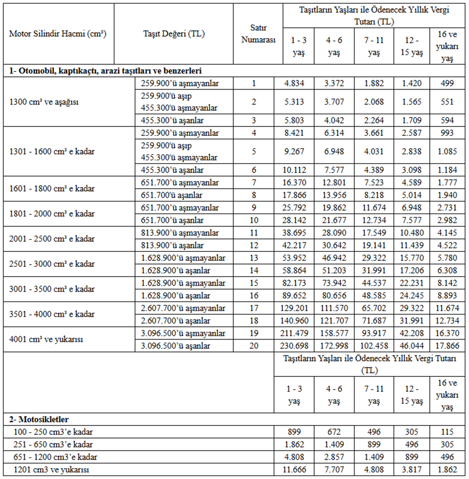 30.12.2024 tarih ve 32768 sayılı Resmi Gazetede yayımlanan Motorlu Taşıtlar Vergisi Genel Tebliği ile beraber 01.01.2025 tarihinden itibaren uygulanacak Motorlu Taşıtlar Vergisi oranları belirlenmiştir. Belirlenen motorlu taşıtlar vergisi oranları aşağıdaki gibidir