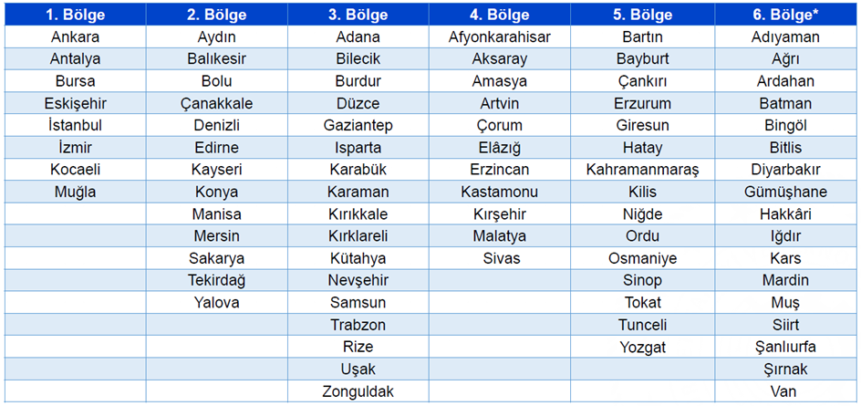 - Bu karar kapsamında yer alan desteklerin uygulanması açısında iller, sosyo-ekonomik gelişmişlik seviyeleri dikkate alınarak altı bölgeye ayrılmıştır.
