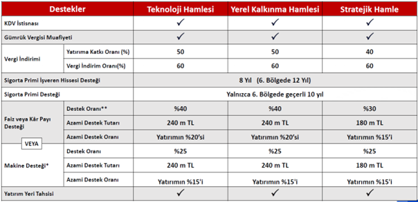 - Türkiye Yüzyılı Kalkınma Hamlesi: Teknoloji Hamlesi Programı, Yerel Kalkınma Hamlesi Programı ve Stratejik Hamle Programı olmak üzere üç programdan oluşur ve bu uygulamalar kapsamında desteklenen yatırımlar bölgesel teşvikler ile aşağıdaki destek unsurlarından faydalanabilirler.
