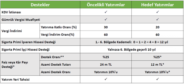 - Sektörel Teşvik Sistemi: Öncelikli Yatırımlar Teşvik Sistemi ve Hedef Yatırımlar Teşvik Sistemi olmak üzere iki teşvik sisteminde oluşur ve bu uygulama kapsamında desteklenen yatırımlar bölgesel teşvikler ile aşağıdaki destek unsurlarından faydalanabilirler.